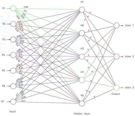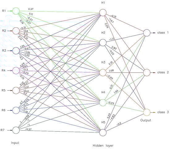 To this point, a first classification of the companies has been made using cluster analysis. Further on, a neural network classification will be trained in order to improve the previous classification and minimize the error of the classification. The neural network will consist of three layers, namely, the input layer containing the seven neurons, each neuron corresponding to one of the indicators R1–R7; the intermediate layer, which will contain five neurons; and the final layer consisting of three neurons, the classes found in the cluster analysis. The number of neurons in the intermediate layer will be determined experimentally, further keeping the network that will minimize the error.
