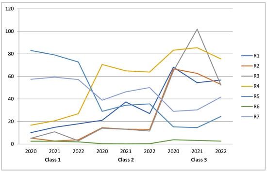 Figure 5). As it is well known throughout the business world, from one year to another, some firms change their activity or disappear. From the class of companies with a good financial situation, only one company was liquidated, probably for non-financial reasons. From the second class, no company has suffered, nor have they changed their object of activity or been dissolved. As for the third class, the financially precarious companies, three companies have dissolved year-by-year, which indicates that, although the logistics sector has benefited during the pandemic, the decisions and strategies taken by managers have led to their bankruptcy.