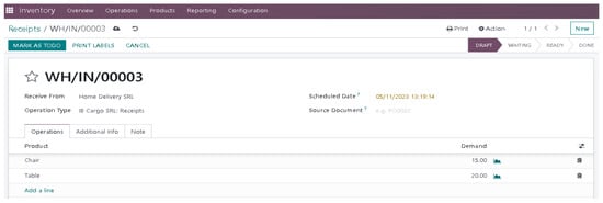 For each product, if it enters the warehouse for the first time and there is no information about it in the database, it is filled in manually. This will require information such as the full name, price, production cost, and storage dimensions (weight, volume, available quantity). If the product is available, the request is directly transferred to the ready or done mode (by pressing the validate button). For each product, a label is generated with the bar codes, as well as the shipping document.