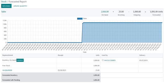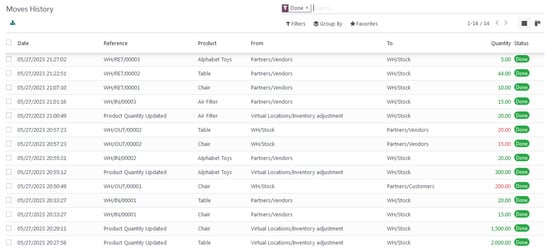 Figure 8), such as products being grouped according to the total quantity traded (total quantity inbound–outbound per product), total quantity traded for each partner (supplier or customer), total quantity in each warehouse (if more than one), and total quantity traded for each warehouse location. Furthermore, for each category, products, partners, warehouses, locations, and the total number of transactions (moves) made are displayed.