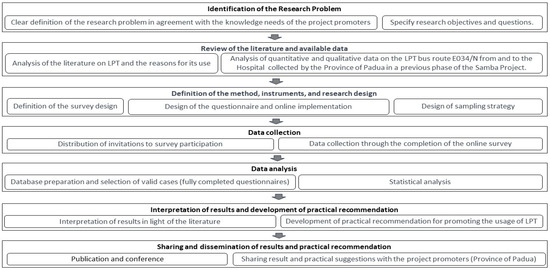 The entire research process related to this study within the broader SaMBA project is illustrated in Figure 1. In the following paragraphs of the article, methodological choices and obtained results will be detailed. The results will then be discussed in the context of the literature, emphasizing the research limitations. Practical recommendations for promoting public transportation will be provided based on the collected data in the conclusions, along with suggestions for future research exploring the addressed theme.