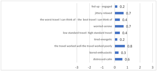 The quality of the travel experience on the LPT was evaluated using the Satisfaction with Travel Scale [32]. The results indicate that the mean scores for each aspect related to the travel experience are positive (Figure 2). This implies that passengers tended to choose adjectives that describe pleasant aspects of their travel experience rather than unpleasant ones. Specifically, they reported experiencing predominantly low arousal and positive emotions during the trip. They felt calm, relaxed, and at ease, perceiving that the travel experience was proceeding smoothly. Overall, the travel experience appeared to be quietly satisfying.
