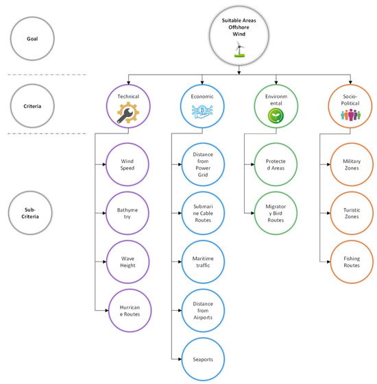 Nevertheless, the full potential of offshore wind energy in the entire Caribbean region has not been completely determined. Despite the existence of a roadmap for the deployment of offshore wind energy in Colombia [25], it is crucial to initiate additional research to identify techniques with greater adaptability and accuracy in modeling the complexity of the factors involved in selecting areas with significant offshore wind energy resource potential. In this research, a GIS–FAHP approach is employed, as it provides a more robust and realistic framework for decision-making in assessing offshore wind energy potential, enabling better consideration of uncertainty and subjectivity in this analysis. This framework is a contribution of this research, as it can serve as a reference for studies in other regions of Colombia and in other countries, after adjusting the criteria according to the availability of information and local legislation. Additionally, the definition of criteria and sub-criteria for the Colombian Caribbean Region is highlighted as a contribution, which allowed us to obtain a unique hierarchical structure for the region under study.