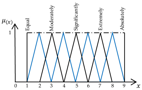 The fuzzy triangular numbers in Table 3 are represented by à = l, m, n, corresponding to the upper and lower limits (l and n) and the mean value (m). The reciprocal values of the fuzzy scale are calculated according to Equation (1). Figure 2 illustrates the implementation of the triangular fuzzy scale, in which the triangular numbers in blue represent intermediate values.