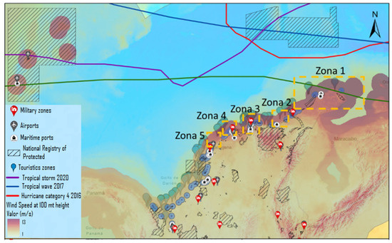 These marine areas are considered unsuitable for the placement of offshore wind systems, as they are used for periodic military operations [6]. On the northern coast of Colombia, there are four military zones near the sea. These areas are exclusively designated for military practices; therefore, in the GIS analysis, they were excluded from the suitable zones for the implementation of offshore systems. Figure S12 shows their locations, which include Riohacha, Santa Marta, Barranquilla and Cartagena.