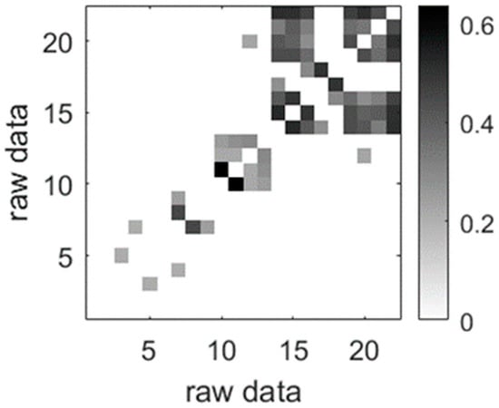 We analyzed the dependencies between variables using the Spearman rank correlation coefficient, which is a non-parametric measure of the monotonic statistical relationship between random variables. Similar to the Pearson correlation coefficient, it takes values in the range of −1 to 1. We examined the mutual dependencies between variables by testing the null hypothesis of no correlation against the alternative hypothesis of a non-zero correlation, assuming a predefined level of significance α = 0.05. As a result of this procedure, we obtained a correlation matrix and a p-value critical value matrix. Strong correlational dependencies should have a p-value smaller than the predefined α value, indicating that the null hypothesis should be rejected. We will refer to such dependencies as significant. Figure 1 presents a visualization of the absolute values of the coefficients matrix for the analyzed group of variables. To capture more than weak dependencies, we set a threshold value for the coefficient at 0.2 (indicating a more than weak dependency). Coefficients with values lower than 0.2 are not marked in the figure. The remaining coefficients with values above this threshold are shaded in varying degrees of gray proportionate to their significance. It can be observed that there is a significant interdependence between the variable groups from P16 to P23. This suggests that respondents are responding to these questions in a very similar manner, indicating that these questions have identical informational potential.