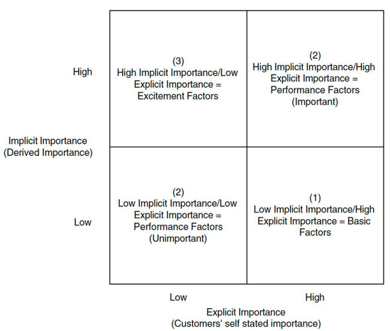 In scientific research, this analysis technique was introduced by Ref. [37], who determined the factors for customer satisfaction by indicating both the explicit importance and the implicit weighting of the derived attributes on a two-dimensional importance grid. Specifically, Ref. [37] suggests that by combining the explicit and implicit weightings of the derived attributes on a two-dimensional grid, three satisfaction factors can be identified (Figure 1).