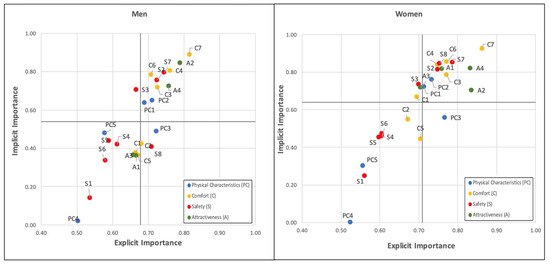 Once the explicit importance and implicit importance values are known, it is possible to classify the factors that may influence users’ decision to walk, identified in Table 1, using importance grids (IG), according to the theory of three factors. The average values of the two importance factors were used to classify the 4 quadrants of the importance grid. The aspects judged by respondents as important performance factors fall in the upper right quadrant; in the lower right quadrant there are the aspects considered basic factors; the aspects judged to be unimportant performance factors fall in the lower left quadrant and the aspects considered excitation factors are found in the upper left quadrant. The following figures show the importance grids for each user category considered.