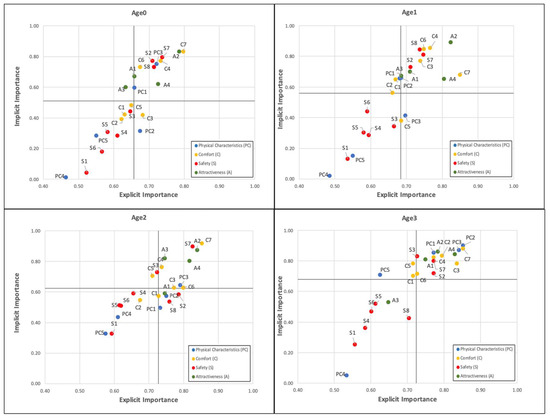 Figure 4 shows the importance grids (IG) for the four items in the “age” category. Respondents in age group 3 (>65 years) indicate the highest number of important performance factors and no basic factors. In addition, the unimportant performance factors for this user category do not follow the typical linear trend. In other words, this suggests that these users lack a true awareness of the factors that fall in the lower left quadrant.
