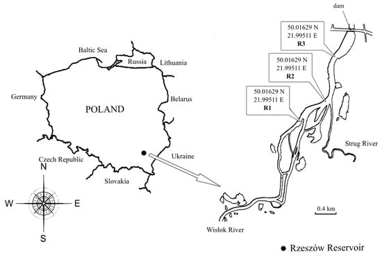 The study focused on the Rzeszów Reservoir in south-eastern Poland. The reservoir was created in 1974 by damming the Wisłok River along 63 + 760 km of its course. It is supplied by two main tributaries: the Wisłok and the Strug. The main function of the reservoir is to ensure the proper functioning of the water supply system of the city of Rzeszów. The catchment area of the Rzeszów Reservoir covers 2025 km2 and includes a large part of the Podkarpackie Voivodeship. The difference in water level between the main tributary of the Wisłok River at its source and the reservoir mouth is 616 m above sea level. The Wisłok flows through the lower foothills, which are mainly agricultural, the upper parts are forested, while in the middle part, there are industrial centres (glassworks, tanneries, refineries). The catchment area of the smaller tributary, the Strugu, is predominantly agricultural, traditionally consisting of fragmented agricultural land with a high population density. The Rzeszow Reservoir is under strong anthropogenic pressure from local agriculture, which causes extensive soil erosion. As a result, mineral substances and diffuse chemical pollutants accumulate in the reservoir [].