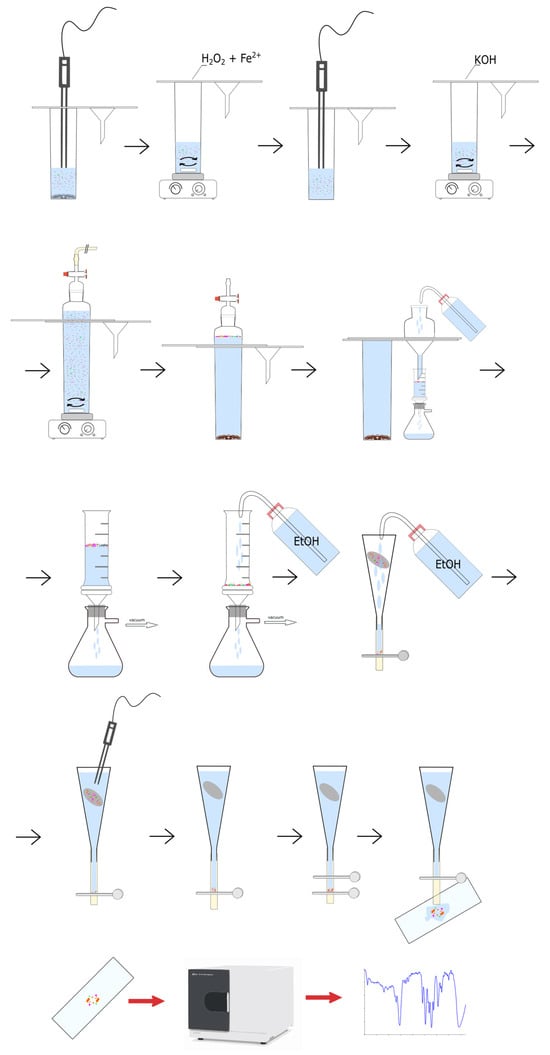 In the next step, 30 mL of a 30% H2O2 solution and 0.28 g of FeSO4∙2H2O were added to the separator and the Fenton reaction was carried out at 50 °C for 24 h. A magnetic stirrer with a Teflon mixing element was used to evenly distribute the reactants and maximise the degradation efficiency of the sample matrix. Concentrations and process conditions were chosen based on the work of [].
