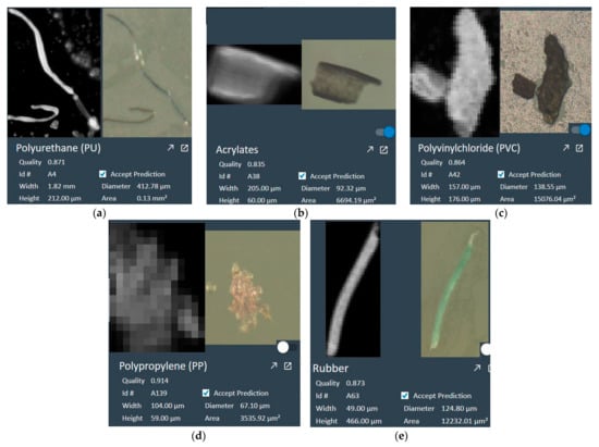 Selected microscopic images of identified MPs: (a) PU particle; (b) acrylate particle; (c) PVC particle; (d) PP particle; (e) rubber particle.