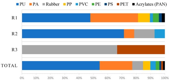 Figure 4 shows the contribution of each polymer type to the total contamination of the MPs. The main contaminant at sites R1 and R2 was PU, while at site R3, it was rubber. Furthermore, not only was the highest abundance of MPs found in the bottom sediments at site R1 in the zone of the reservoir most affected by inflow, but also the highest abundance of different polymer types. The lowest levels of MPs, both in terms of quantity and quality, were found at site R3, which is closest to the dam.
