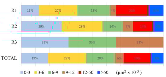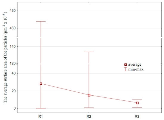 Variation in the size of the identified MPs was also observed. The bottom sediments at site R1, located in the upper part of the reservoir, were characterised by the highest proportion of particles with the largest surface area, while at site R3, near the dam, the sizes of the MPs were the smallest (Figure 5 and Figure 6).