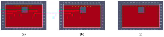 - The relative position of the steel bars affects the simulation scheme. In order to investigate the impact of the rebar’s relative position on the void detection beneath it, two layers of rebars were positioned at depths of 0.05 m and 0.15 m from the surface in the model, with a spacing of 0.2 m and a diameter of 20 mm. A rectangular void is positioned with air as the filling medium, situated 0.2 m below the upper surface and measuring 0.3 m in height and width. The two rows of rebars are arranged in three different configurations: (1) both layers of rebars are vertically aligned; (2) the two layers are staggered vertically; (3) the two layers of rebars are interlocked with each other.