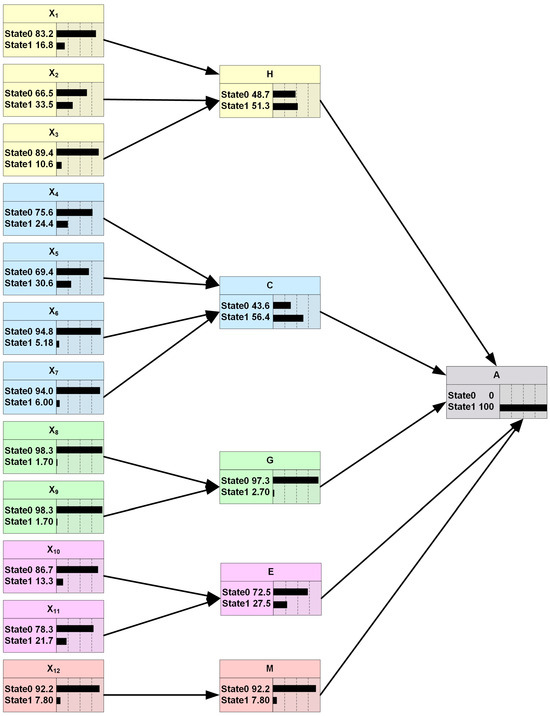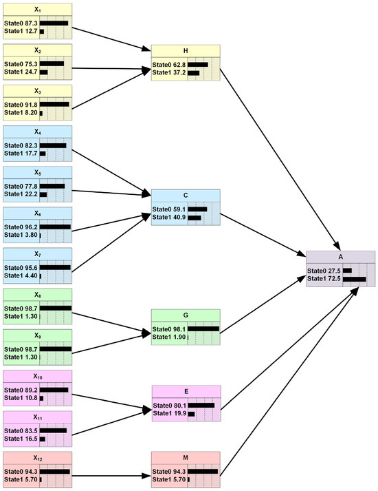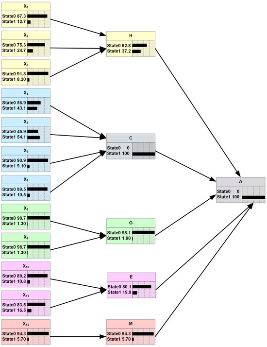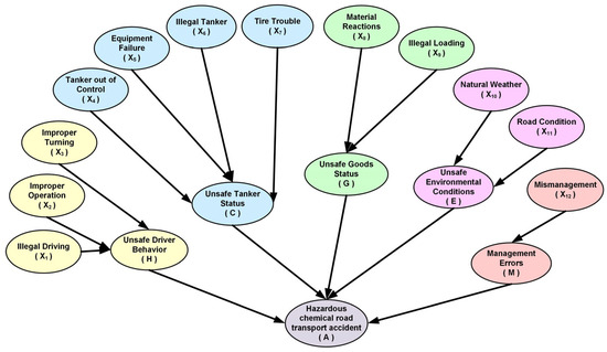 After clarifying the interaction relationship among node variables, the BN graph of road transport accidents of hazardous chemicals is drawn (Figure 3), in which a hazardous chemical road transport accident is defined as the target node, recorded as A. The five core categories, including Unsafe Driver Behavior, Unsafe Tanker State, Unsafe Goods State, Unsafe Environmental Conditions, and Management Errors, are taken as intermediate nodes, which are, respectively, coded as H, C, G, E, and M in the BN graph. The 12 categories, including illegal driving, improper operation, improper turning, tanker out of control, equipment failure, illegal tanker, tire trouble, material reactions, illegal loading, natural weather, road condition, and mismanagement, are taken as root nodes, which are coded sequentially from X1 to X12 in the BN graph (Figure 3).