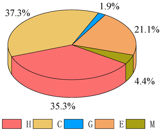 The conditional probability quantifies the degree of influence of the parent node on the child node. Based on the determination of the network structure of hazardous chemical road transportation accidents, the proportion of parent nodes (root nodes) to child nodes is calculated according to the number of accidents caused by each parent node that have been counted and the number of accidents that have occurred in the child node (Table 5). For the five non-root nodes of Unsafe Driver Behavior, Unsafe Tanker State, Unsafe Goods State, Unsafe Environmental Conditions, and Management Errors, the proportion of each node to the number of road transport accidents of hazardous chemicals is calculated and then normalized. The proportion of the five non-root nodes to the total accident number is shown in Figure 4.