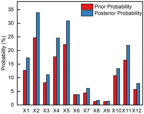 Then, we can find the parent node with the largest posterior probability in reverse. Among the influencing factors of hazardous chemical road transport accidents, the nodes of X2 and X5 have a posterior probability as high as 33.5% and 30.6%, respectively, and are the main contributors to the occurrence of hazardous chemical road transport accidents. On the other hand, the nodes of X8 and X9 have a low probability of triggering a hazardous chemical road transport accident, which is in line with reality. A comparison of the prior probability and posterior probability of the root node is shown in Figure 7. If the state of the target node of a hazardous chemical road transport accident (A) is set to 1, the probability of occurrence of each node exhibits significant changes. Changes in the probability of the basic events X2, X4 and X5 are significant (Figure 7), which indicates that these factors have a greater impact on road transport accidents involving hazardous chemicals and should be given sufficient attention. Among the five child nodes, the posterior probability of the node of Unsafe Tanker State (C) is the largest (Figure 6). Therefore, it is inferred that the causal chain is from A to C. Among the three parent nodes of Unsafe Tanker State (C), the posterior probability and the probability change of equipment failure (X5) are the largest (Figure 6 and Figure 7), which infers a chain from C to X5.