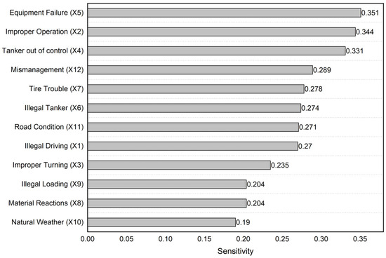 A sensitivity analysis [47] is a technique that helps to validate the probabilistic parameters of the BN, which is conducted to quantitatively identify the effect of small changes in the numerical parameters of the model (i.e., prior and conditional probabilities) on the output parameters (e.g., posterior probabilities). Highly sensitive parameters have a more significant impact on the inference results. To identify the key impact factors for the target node of hazardous chemical road transport accidents (A), a sensitivity analysis of other nodes was conducted, where the node with highest value is screened out as the key impact factor. The results indicate that the node of equipment failure (X5; 0.351) is the most sensitive, which contributes most to the target node (Figure 9), followed by the nodes of improper operation (X2; 0.344) and tanker out of control (X4; 0.331). This finding is consistent with the result of the forward analysis, which further proves the accuracy of our BN model. Compared with the nodes mentioned above, the node of natural weather (X10; 0.19) is the least sensitive to the target node, followed by material reactions (X8; 0.204) and illegal loading (X9; 0.204). Therefore, the key impact factor of hazardous chemical road transportation accidents is the node of equipment failure (X5), which contributes most to the intermediate node of Unsafe Tanker State (C).