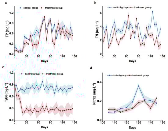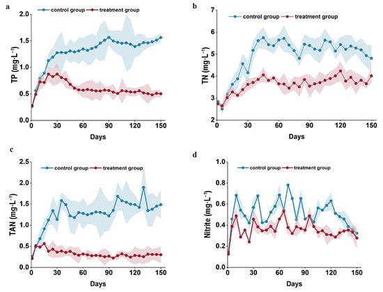 Figure 3 illustrates the dynamic changes in major water quality factors in the culture pond for Japanese eel during the experiment. The TN concentration in the treatment group fluctuated between 0.901 and 5.623 mg/L, while that in the control group ranged from 1.470 to 6.195 mg/L. The TN fluctuation in the treatment group was lower and, overall, it showed a downward trend (Figure 3a). The TAN concentration in the treatment group fluctuated between 0.195 and 0.867 mg/L, while that in the control group ranged from 0.719 to 0.887 mg/L. The TAN in the treatment group showed a downward trend (Figure 3b). The TP concentration in the treatment group fluctuated between 0.059 and 1.093 mg/L, while that in the control group ranged from 0.083 to 1.010 mg/L. The TP concentration in both treatment groups showed an upward trend overall but the concentration in the treatment group was generally lower than that in the control group (Figure 3c). The nitrite concentration in the treatment group fluctuated between 0.085 and 0.231 mg/L, while that in the control group ranged from 0.083 to 0.360 mg/L. The nitrite concentration in the treatment group showed a downward trend with a smaller increase than that in the control group (Figure 3d). These results indicate that the water quality of Japanese eel culture ponds improved significantly using the water treatment technology developed in this study.