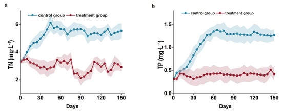 The dynamic change trend of water quality factors in the tailwater of Japanese eel culture during the experiment (a) is the dynamic change trend of TN in Japanese eel culture and (b) is the dynamic change trend of TP in Japanese eel culture. The shaded part of the figure shows the continuity error.
