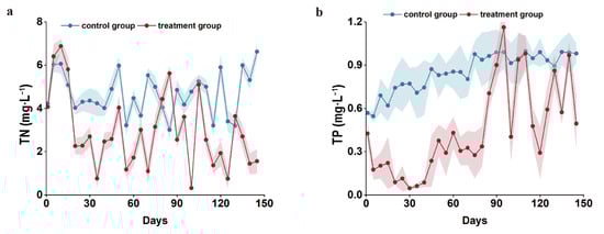 The dynamic change trend of water quality factors in the tailwater of largemouth bass culture during the experiment (a) is the dynamic change trend of TN in largemouth bass culture and (b) is the dynamic change trend of TP in largemouth bass culture. The shaded part of the figure shows the continuity error.