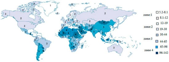 The amount and rate of dust deposition on a PV module’s surface depend on the weather conditions of a particular location []. The concentration of dust particles and pollutants is not the same in different parts of the world, depending on the local conditions. A classification of different countries according to the characteristics of dust concentration and climatic zones is mapped in Figure 1. The dust concentration is represented through PM10, a common metric that expresses the mass of liquid and solid particles of diameter < 10 µm suspended in 1 m3 of air []. The darker color on the map represents a higher PM10 concentration; this decreases as the color gets lighter.
