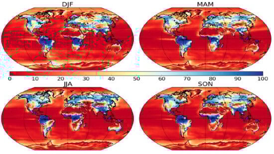 Geographical locations of seasonal dew incidence as a proportion of a day (%) []. MAM (March, April, and May), DJF (December, January, and February), JJA (June, July, and August), and SON (September, October, and November).
