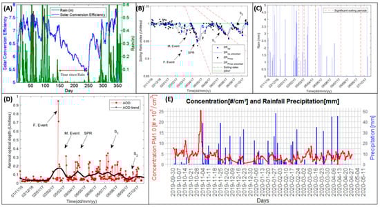(A) In 2010, a time series of daily solar conversion efficiency and daily rainfall was recorded at an 86.4 kWdc PV facility in Santa Clara, CA, USA []; (B) soiling ratios and rates for different seasons []; (C) rain frequency []; (D) AOD variations []; (E) concentration of suspended particles due to rainfall precipitation [].