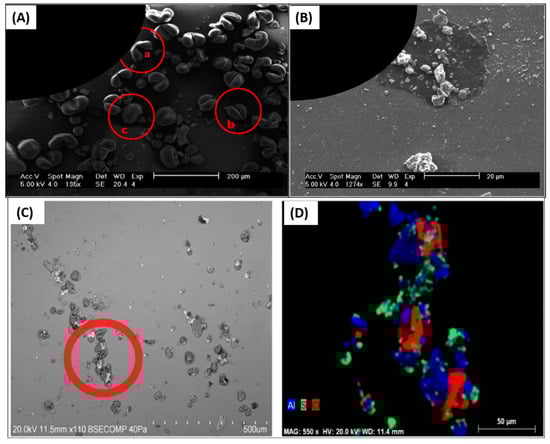 (A) SEM images of glass sample (30° tilt angle); identification of pollen: (a, b, and c are pine, maple, and oak) []; (B) SEM image for surface of a glass sample after rain fall (30° tilt angle) []; (C) SEM image of agglomerated dust particles []; (D) EDS images of exposed glass samples [].