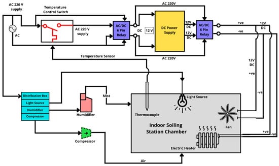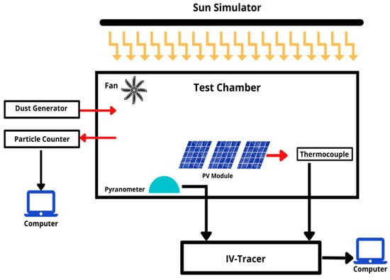 Naveed et al. [] assembled an indoor soiling chamber to investigate dust deposition patterns and losses on PV modules. The overall working system concept with electrical connections and components used is shown in Figure 6. A PV module was subjected to a daily cycle of outdoor circumstances, and it was observed that after seven days, the module lost 33.54% of its Isc. The suggested soiling station was to investigate the optimum soiling loss on PV modules by altering the elevation angle and atmospheric conditions.