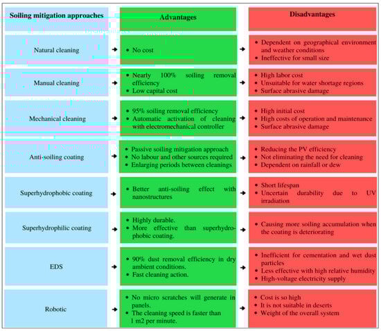 The conversion of energy in a PV system depends on the irradiance and spectral content radiated from the sun, along with environmental and climatic variables, the integral system, and the balance of systems []. Soiling PV modules is the third major concern for the success of PV technology after irradiance and temperature [,]. Soiling intrinsically affects PV modules, gradually accumulating after the installation of the PV power plant. As a result, the output power and efficiency may completely terminate in the long run [,]. Over the years, the impact of soiling has been investigated in several regions worldwide, especially in regions where such soiling is a major showstopper issue or solar energy is the only option to generate electricity [,,,,,]. Ilse et al. estimated that 4% to 7% of the global energy yield is currently lost because of soiling []. While the economic repercussions of this loss significantly affect PV owners and operators, the magnitude of this phenomenon also unveils an untapped potential: with effective soiling mitigation, the global PV energy yield could be elevated with no additional land or material consumption. This does not eliminate the need for additional PV systems but proves that the land and material efficiencies of PV can and should be enhanced through an adequate soiling mitigation strategy. In this light, an assessment of soiling loss characterization and mitigation techniques is the main aim of the present work.