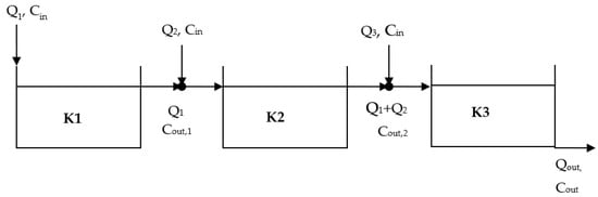 For the numerical investigation of the problem, first the tanks-in-series (TIS) methodology is used [], which is based on finite volume method [,]. It is considered that the wetlands are operated as continuous stirred-tank reactors (CSTRs), under steady conditions, and the volumetric degradation coefficient λ is used. According to the experimental procedure [], the tank is divided into three equal cells (Figure 2), with corresponding volumetric degradation coefficients λ1, λ2 and λ3.