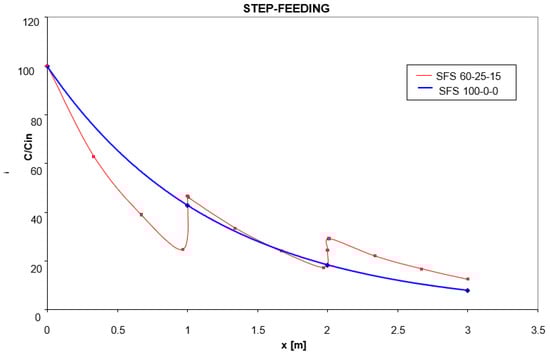 In Figure 3, the outlet BOD concentration without SF is Cout,A = 8.42 mg/L, while that with SF is noticeably higher, Cout,D = 17.47 mg/L. The inequalities (11) and (16) could explain the occurrence of the “leaps” in the longitudinal concentration distribution profile at the feeding positions x1 = 1 m and x2 = 2 m.