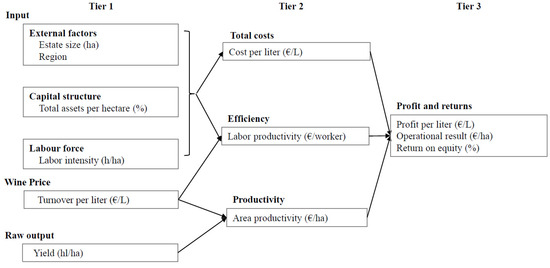The framework will briefly be described from top left to bottom right. Land, capital and labor represent traditional economic input factors, the latter two are operationalized as total assets per hectare and labor intensity. Jointly, the input factors result in the raw output of wine, measured as the yield in hectoliters per hectare. The wine price represents the market valuation of the wine, measured as the average price derived by dividing overall turnover by production volume. The cost per liter is derived from the total cost and an imputed renumeration of family staff divided by the production volume. Efficiency is operationalized as labor productivity that represents the turnover per worker. Similarly, area productivity relates the turnover to the production factor of land (vineyard area). The final set of benchmarks of profit and returns are most comprehensive by relating revenue and cost per output (profit per liter), revenue and cost (operational result), as well as revenue and cost per equity (returns). These performance indicators of Tier 3 (especially the operational result per ha), can be appointed as the goal variables for long-term economic sustainability, while previous performance indicators within the framework serve as measures to locate issues resulting in a lack of success in Tier 3. The dependent performance indicators are defined in detail in Table 1.