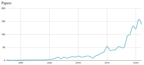 This topic started to be researched as early as 1975, when two scientific papers were produced. The maximum number of papers produced in this field was in the year 2021 with 159 papers, which then decreased to 150 papers the following year (Figure 1).