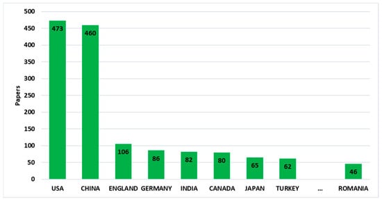 In terms of countries with the most publications in the Web of Science database, the USA (473 papers) is in first place, followed by China (460 papers) and England (106 papers). Romania ranks 14th with 46 papers on the subject analysed, which shows that it attaches importance to this subject due to its impact on the economy.
