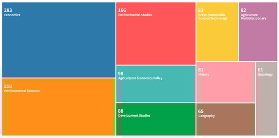 According to the Web Of Science database, the top 10 categories in which most scientific papers were included are economics (283 papers), environmental sciences (218 papers), environmental studies (166 papers), agricultural economic policy (98 papers), development studies (88 papers), green sustainable science and technology (83 papers), multidisciplinary agriculture (82 papers), history (81 papers), geography (65 papers) and sociology (61 papers) (Figure 3).