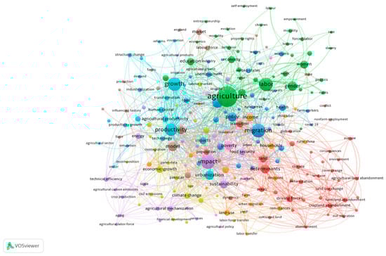 Linking “agriculture labour force” with other related terms. Source: authors’ own processing based on WoS results using VOSviewer.