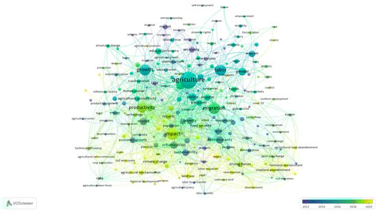Figure 5. Linking “agriculture labour force” to other related terms by year. Source: authors’ own processing based on WoS results using VOSviewer.