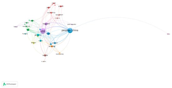 The link between co-author countries. Source: authors’ own processing based on WoS results using VOSviewer.