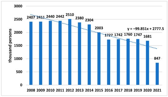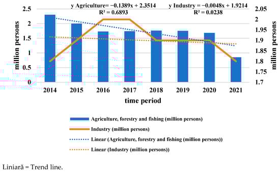 According to statistical data, for the period of 2014–2022, Romania’s employed population is on average 8.41 million people, of which 55.8% (4.689 million people) represent the urban population, and 44.2% (3.721 million people) represent the rural population. Agriculture, forestry and fishing represent on average 20.7% (1.762 million persons) of the total employed population, with the distribution by residence being 8.7% in urban and 91.3% in rural areas (Table 6).