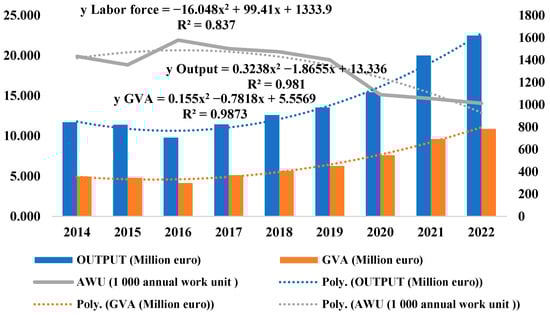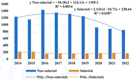 The volume of the labour force in agriculture in Romania for the period of 2014–2022 shows a downward trend, with a negative annual growth rate (−4.24%), with a downward trend for both non-employees (−4.54%) and employees (−2.59%), as shown in Table 5, column 7. According to the regression equation, the agricultural labour force in the non-salaried group, for the period of 2014–2022 increased, on average, by 124.14 AWU/year, and the coefficient of determination (R2) of 80.14% highlights the percentage of how much of the variation in the dependent variable (1000 AWU non-salaried) is explained by the regression equation. As for the group salaried in agriculture, there is a decrease, on average, of 24.72/1000 AWU/year.