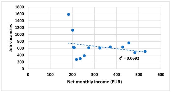 Given the research on the relationship between wage earnings and job vacancies [33] and the trend in Romania [34], we consider the second hypothesis (H2) in which wage earnings inversely influence the number of job vacancies in agriculture.