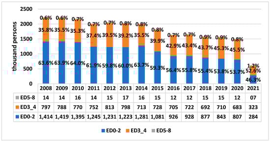 The statistical data show, in part, how the agricultural requirement of the future fits in, in that average annual growth rates are observed for the university level of education (+5.84%) and for the high school level (+1.87%). A considerable reduction is recorded at the secondary school level (−10.78%), at the primary school level (−16.23%) and at the level of those with no schooling (−6.42%), as shown in Table 4, column 7. A deterioration in the level of education is observed in rural areas. The causes are due to the standard of living and quality of rural life. Declining education rates for the mentioned levels will have repercussions on future generations entering the labour force, with negative effects on labour efficiency and productivity. Such phenomena represent long-term obstacles to the formation of high-performance and competitive agriculture [38]. The agriculture of the future needs a new type of farmer, who must be a good agronomist and animal scientist, a better plant protection specialist, a better financial analyst, a better computer scientist and a better marketing specialist [38].