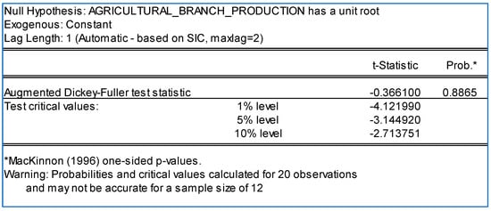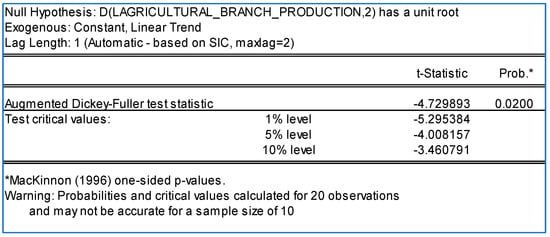 As can be seen from Figure 15, by logarithmising the data string of the deponent variable, it was possible to obtain a new data series, which is stationary according to the Standard Unit Root Test, with the level of the statistical parameter t of the Dickey–Fuller test being statistically representative and the probability level being 0.02 below the maximum accepted threshold of 0.05 (5%).