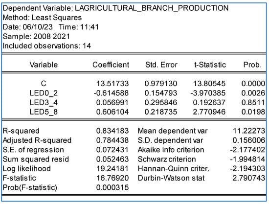 From the model presented above, it can be seen that unfortunately, it is not statistically validated, and that the level of the t-Statistic parameter for the second independent variable, namely the population employed in agriculture with a medium level of education (LED3_4), is statistically unrepresentative, with the probability value being above the maximum accepted level of 5%. Thus, we propose the elimination of this variable and the resumption of a model that considers the dependent variable and the two independent variables, namely the population employed in agriculture with a low and high level of education (Figure 17).