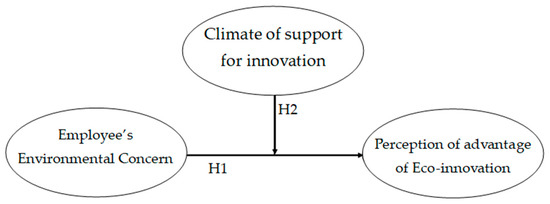 Organizational psychology identifies psychological and organizational climates as intriguing variables capable of elucidating how the thoughts of individual members become intertwined with the collective mindset within organizations. Psychological climate, used to describe how single individuals perceive the organization, was the basis of developing the construct of the organizational climate, used to describe how teammates, or staff of entire departments, perceive the organization. Organizational climate allows us to comprehend how organizational contexts influence how workers perceive changes and the introduction of new practices [41], assimilate information [42], and value certain factors over others [43]. When climate concerns innovation, it is defined as employees’ perception of working in an environment that provides time, cooperation, practical support, and resources to implement new ideas and proposals [23]. Organizations that provide support for innovation tend to create a context in which ideas can be discussed, tested, and implemented. We argue that climate of support for innovation may create conditions in which employees’ environmental concern is related to the perception of eco-innovations as an advantage for the organization.