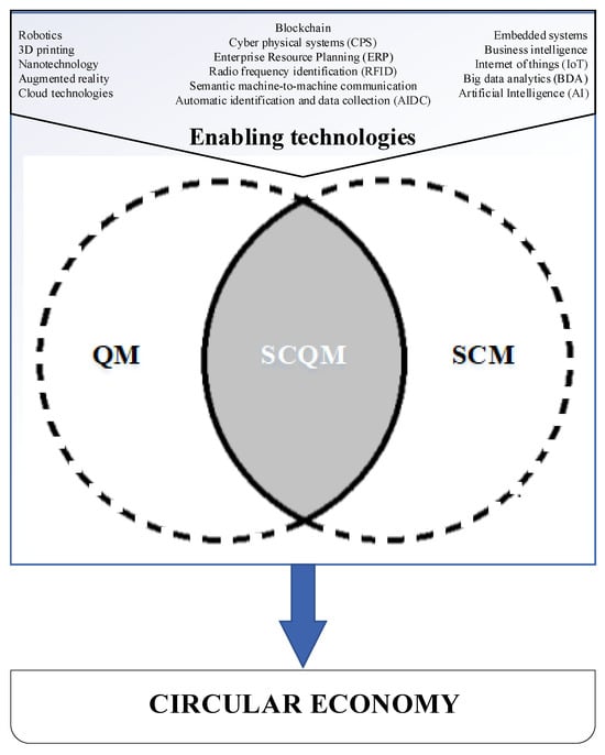 In today’s fiercely competitive and rapidly evolving corporate landscape, the repercussions of unsustainable and environmentally harmful consumption and production practices have reached an untenable level [7,12]. The shift from a conventional linear economic model to the emergence of a closed-loop supply chain, prioritizing restoration and regeneration, is propelled by the “circular economy” (CE) concept [13]. It is anticipated to provide remedies for society’s sustainability, environmental, and economic challenges [14]. There is a growing belief that the incorporation of I4.0 technologies will have a constructive impact on the development of a CE-based sustainable supply chain e.g., [15,16,17]. Previous research has suggested that such initiatives, especially in QM, play a significant role in advancing sustainability, providing advantages to businesses through improved data visibility and transparency e.g., [3,5,8]. For instance, I4.0 is found to positively correlate with CE practices in manufacturing companies in Ecuador, as determined by Khan et al. [12]. Given the study’s emphasis on ‘environmental sustainability,’ it is widely acknowledged that the CE, as opposed to a linear economy, is generally seen as environmentally friendly and capable of enhancing resource efficiency. Nevertheless, the environmental perspective is often overlooked, resulting in inadequately informed and occasionally incorrect decisions [18]. According to Yu et al. (2019) [19], the adoption of QM within supply chains, known as SCQM, has surfaced as a pivotal method for elevating product and process quality, thereby establishing a favorable connection with environmental performance.