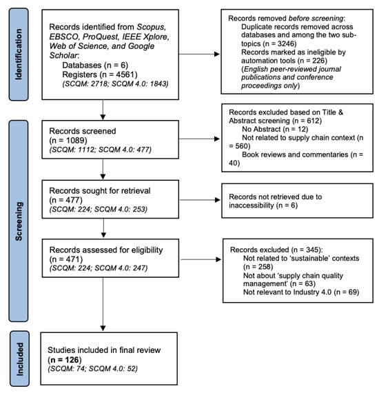 For the present study, the researchers adopted the Preferred Reporting Items for Systematic Reviews and Meta-Analyzes (PRISMA) 2020 procedure, as updated by Barnett- Page et al. (2021) [21], to perform systematic reviews, including criteria for inclusion and exclusion, as well as phases in the process, such as the initial preparation, the evaluation, and the qualification. In Supplementary Materials, Important criteria from the PRISMA checklists are used to construct our SLR. The PRISMA 2020 statement is crucial to ensure the reduction of bias in our research design. In the pursuit of improving the coordination and integration of SCQM, a suitable analytical model based on SLR has been constructed. SLR was created with the intention of laying the groundwork for robust knowledge bases, which in turn would allow for in-depth investigation and analysis [7,22]. In addition, SLR provides a thorough research approach for resolving research difficulties by means of a thorough paper scan, extensive annotations, importance assessments, and a mapping of the “known” and “unknown” for the investigated themes [2,23]. Valuable insights are garnered through thought-provoking considerations planned at future theory-building in these domains; specifically, our exploration extends into the realm of strategic management [24]. Moreover, an SLR is regarded as a robust and verifiable method that catalyzes the formulation of theories, adheres to guidelines, and culminates in well-founded conclusions [10,25]. Due to its capacity to mitigate potential bias, the SLR process ensures a centralized, transparent, and repeatable evaluation of essential research, instilling a high level of confidence in the findings [23,26,27]. The essential process for a thorough and cohesive SLR is organized into three distinct phases: planning, conducting, and reporting [27]. The PRISMA 2020 statement’s identification stage is carried out, and the results are presented in Figure 2 and Table 1 for use in formulating the search strategy.